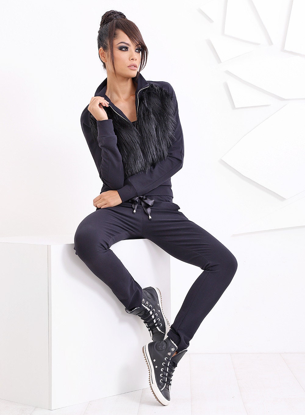 Extravagant women blouse made of cotton and elastan with faux fur on the front. Long sleeve and zipper for closure.