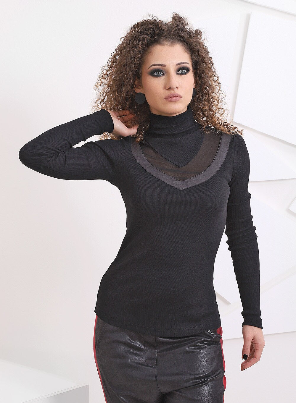 Black Turtleneck long sleeved top with accents of tulle and faux leather on the nekcline!
