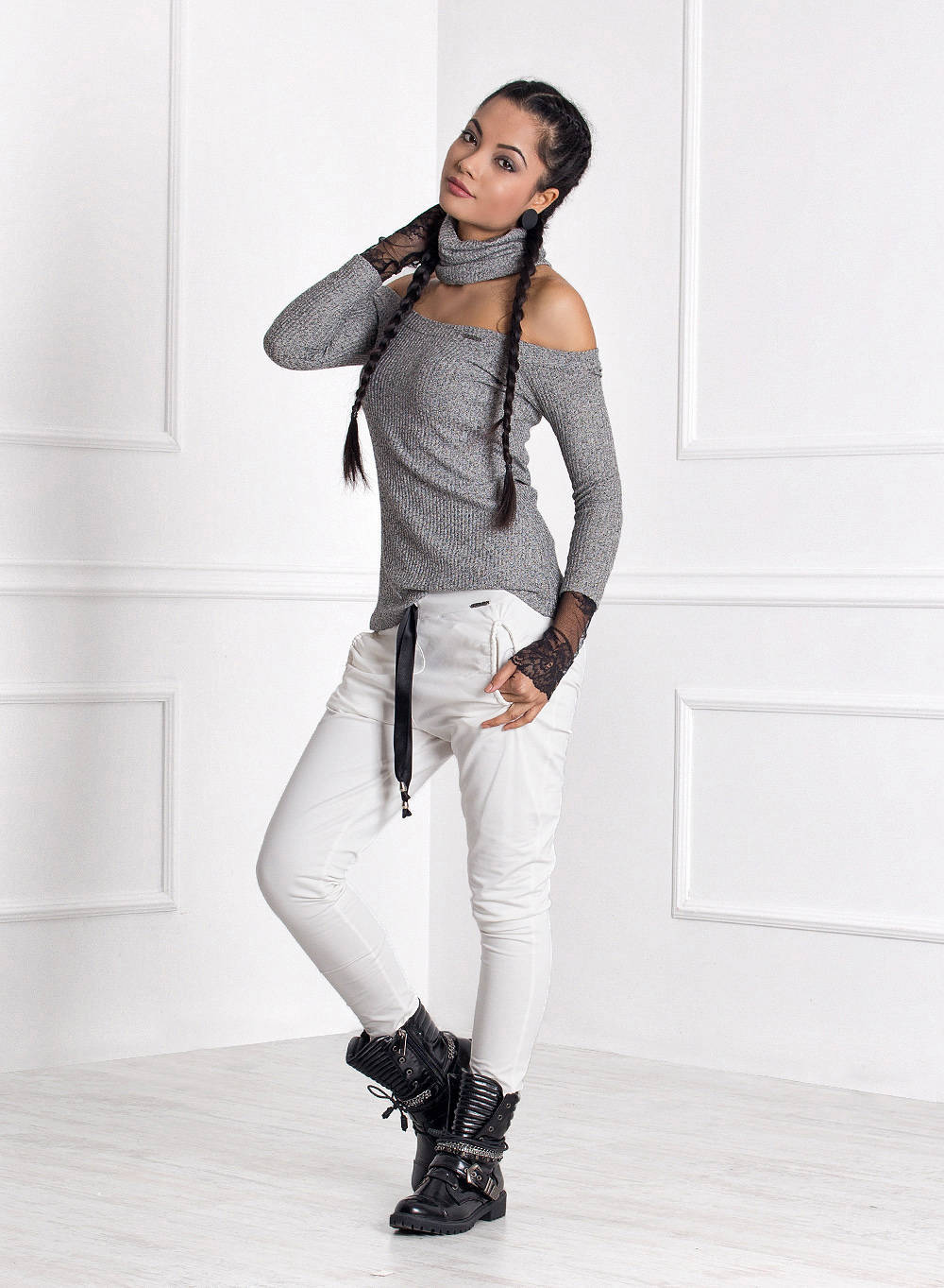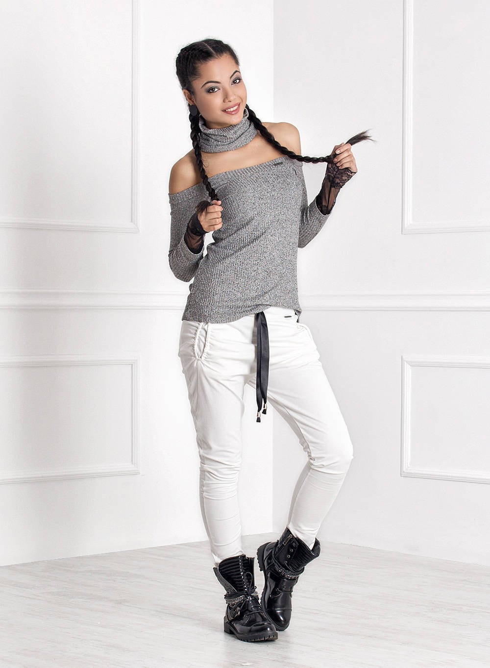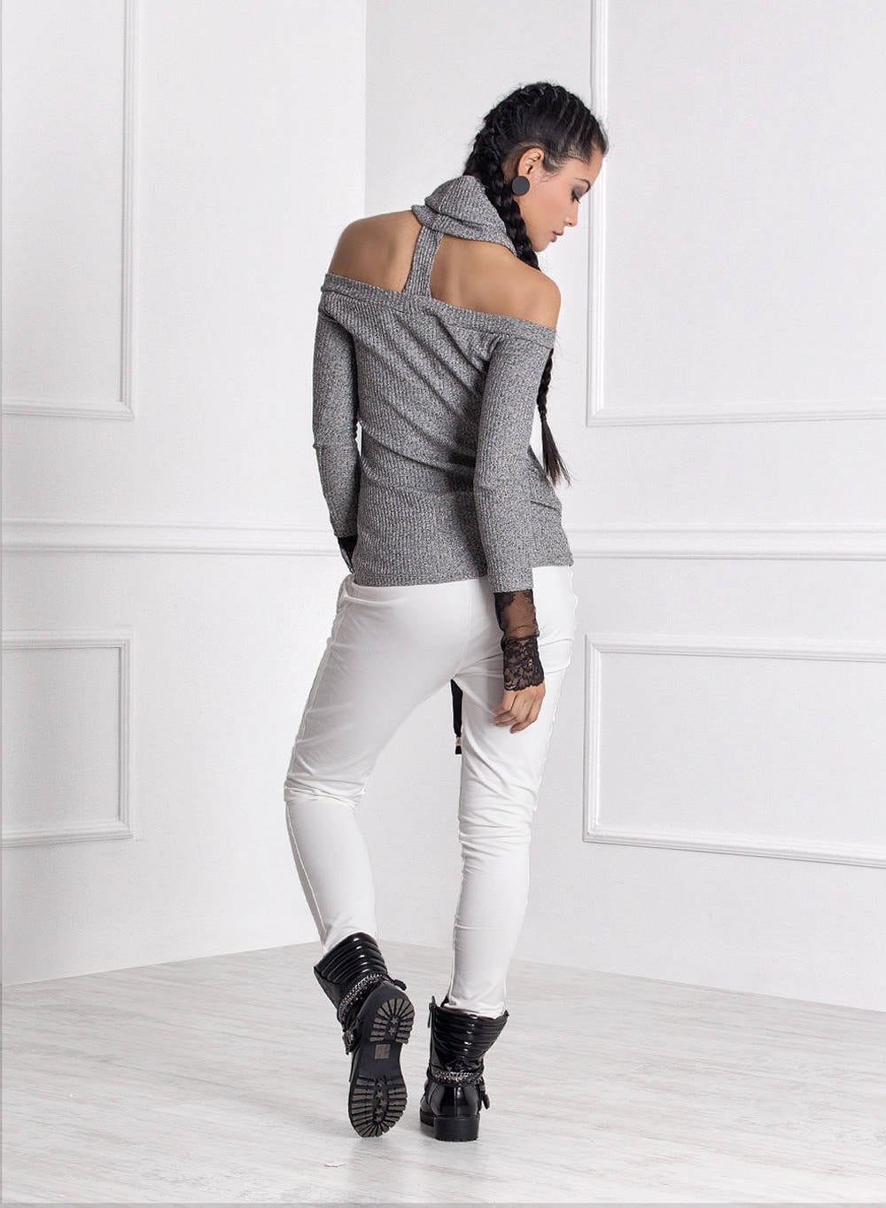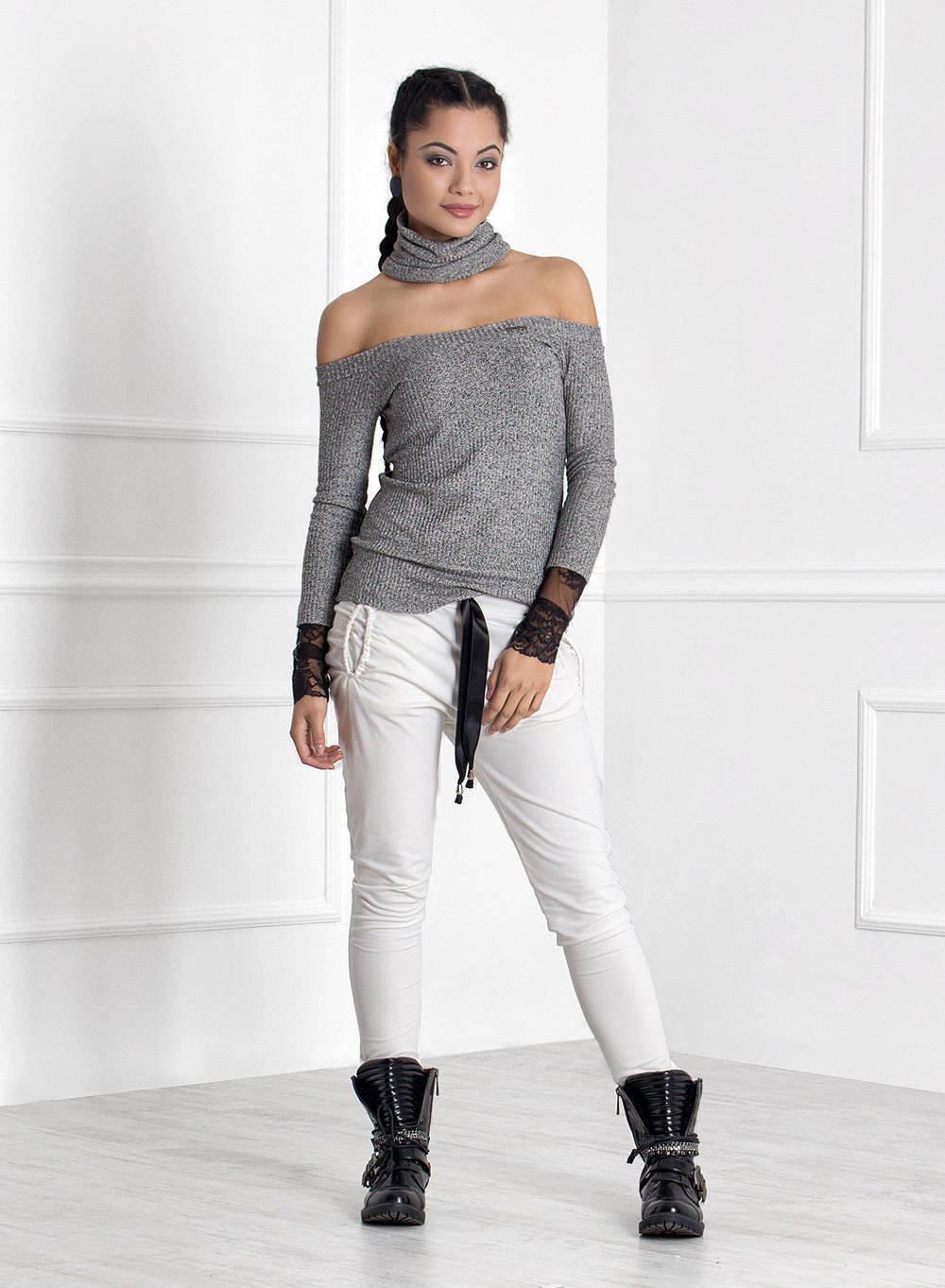 Turtleneck Blouse, Off Shoulder Blouse, Gray Sexy Top, Woman Cotton Blouse, Elegant Lace Blouse by Friends Fashion