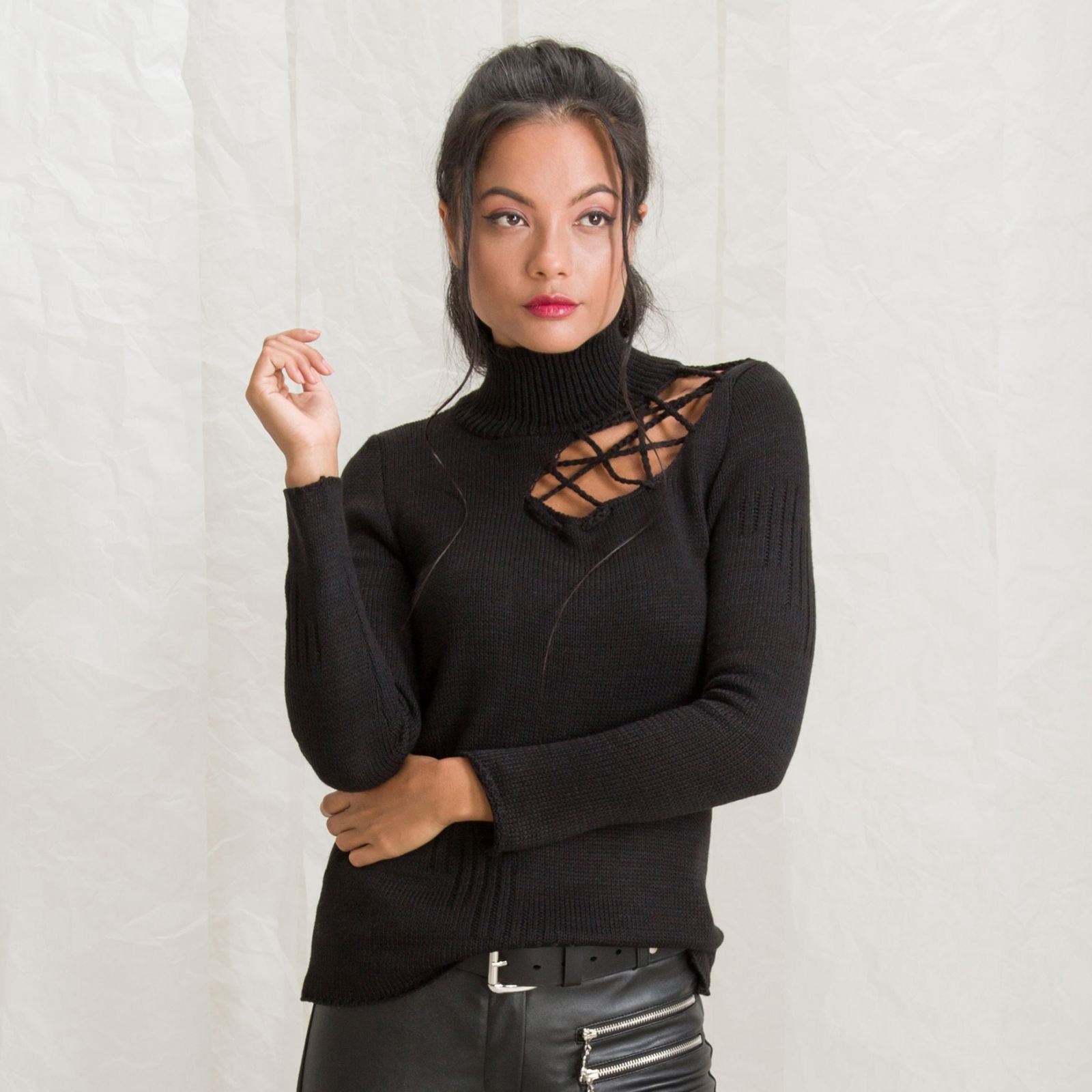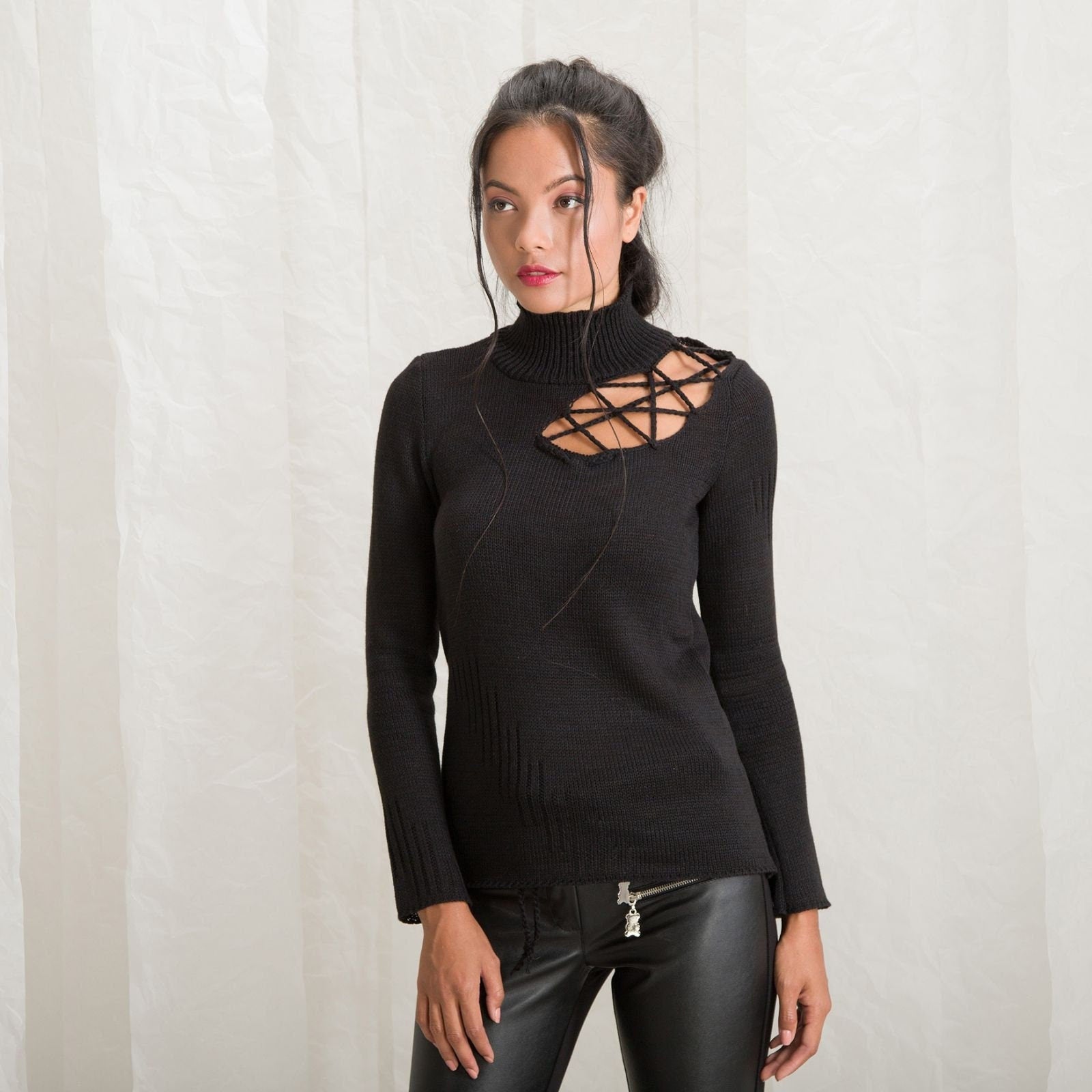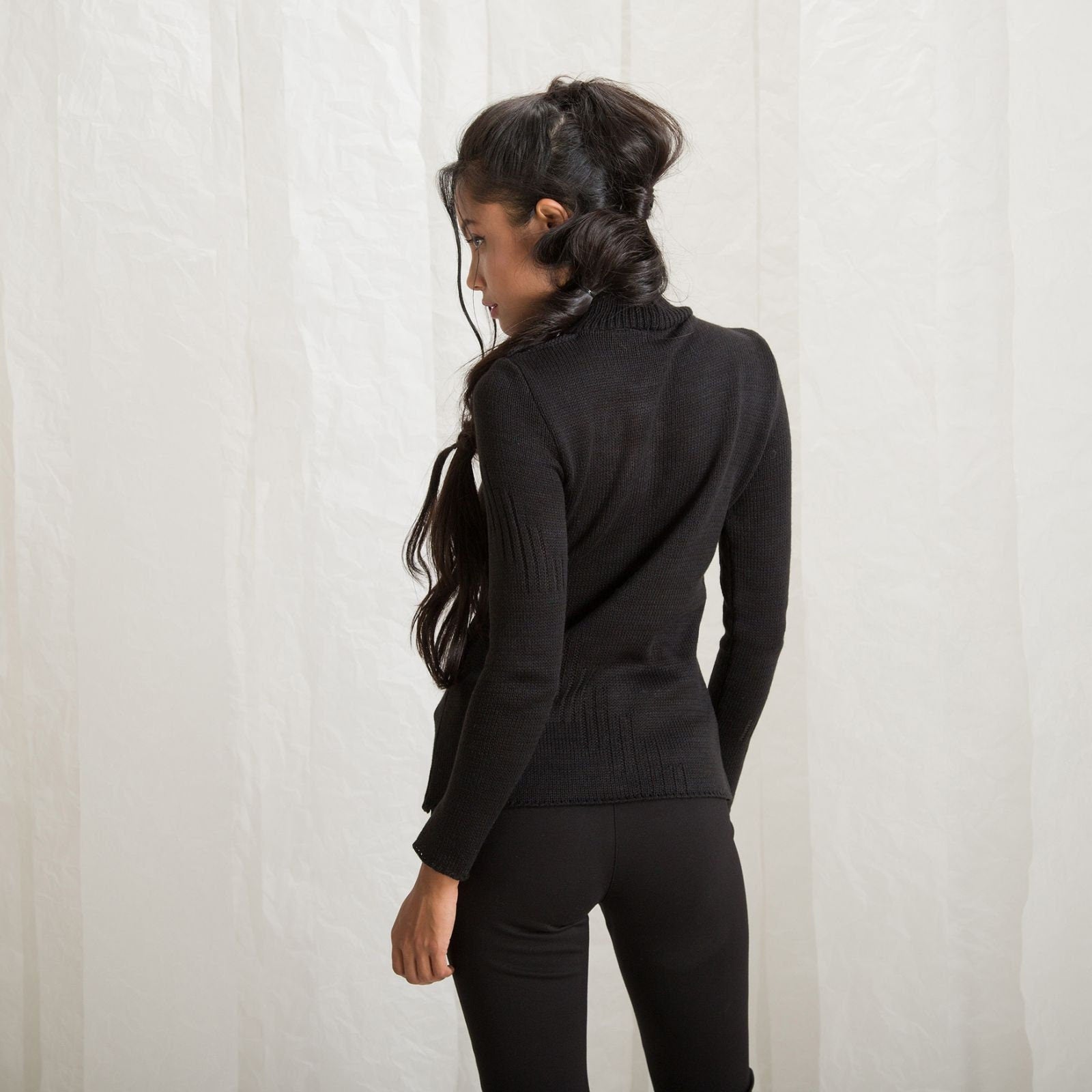 The colour is our favorite, traditional black. You can round it out with almost every piece of adornment you have in you collection. The blouse has turtleneck and the wool is delicate and easy to wash.