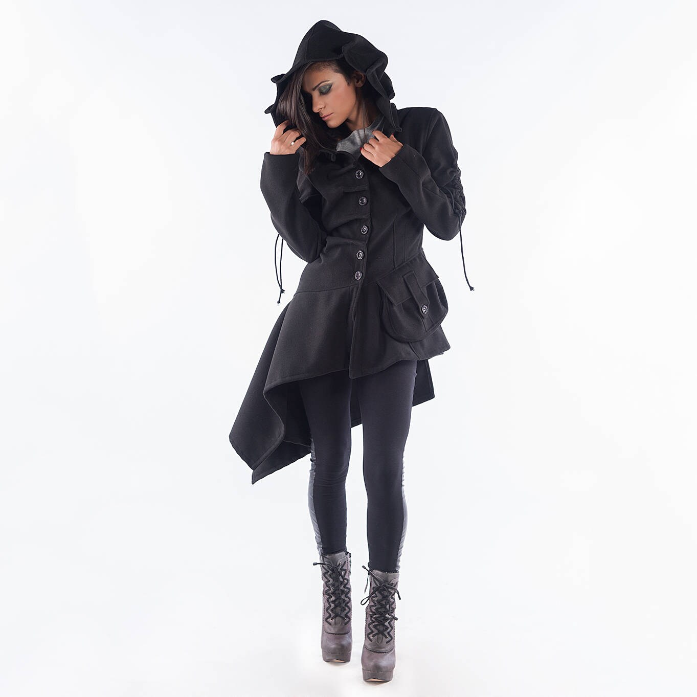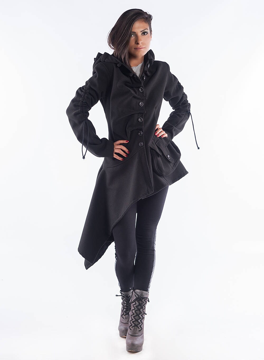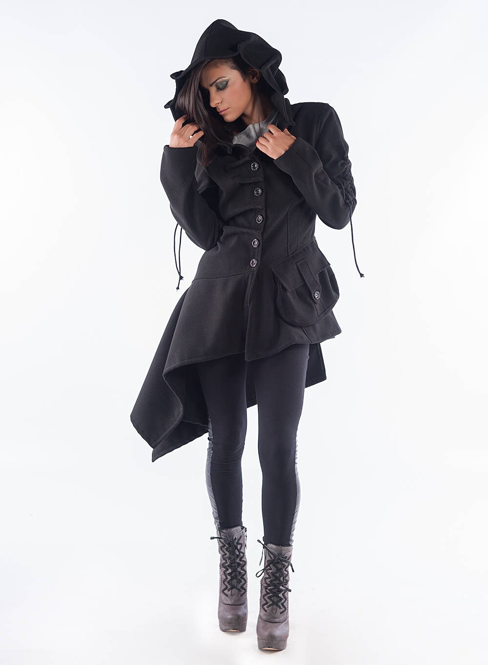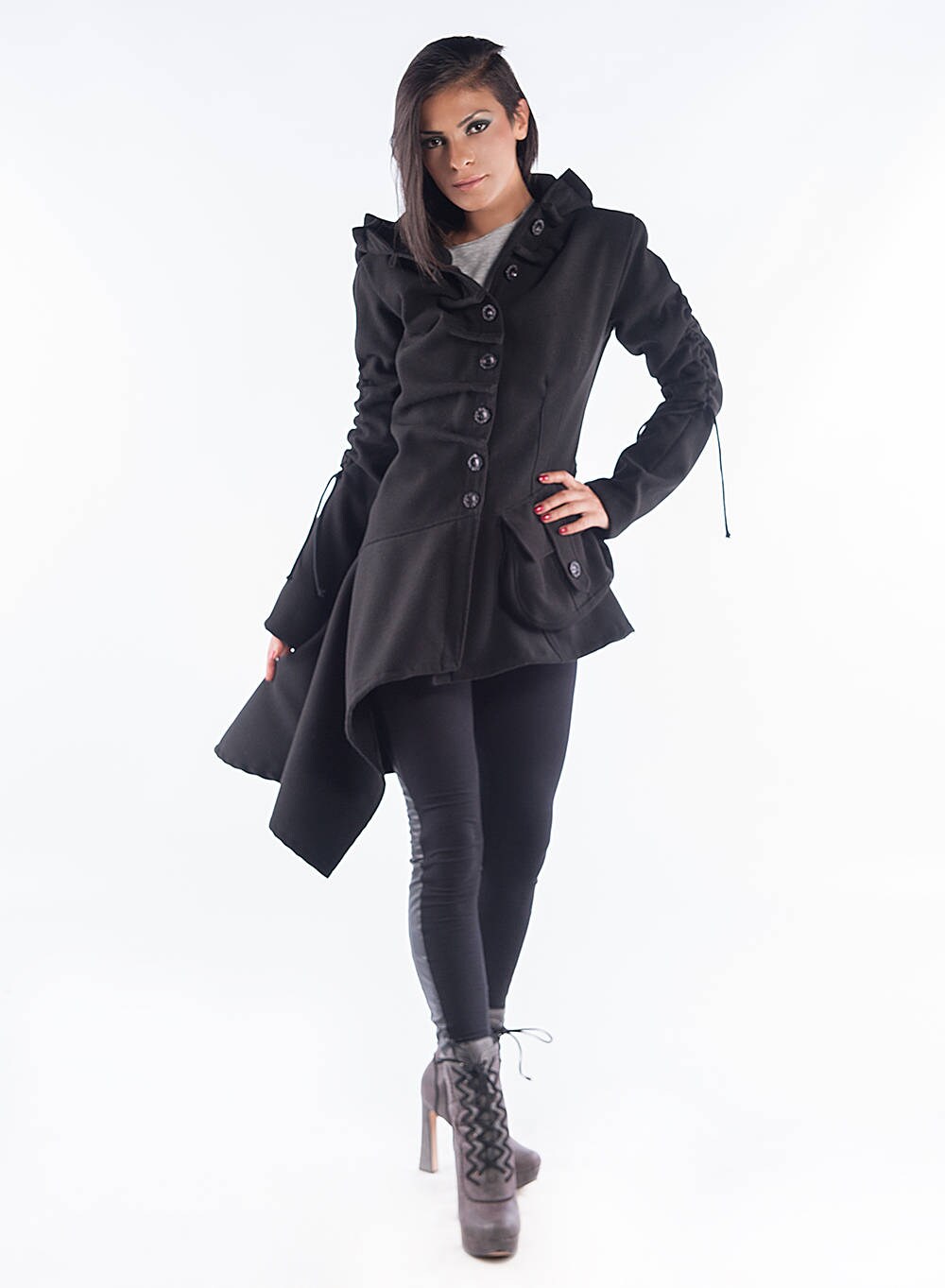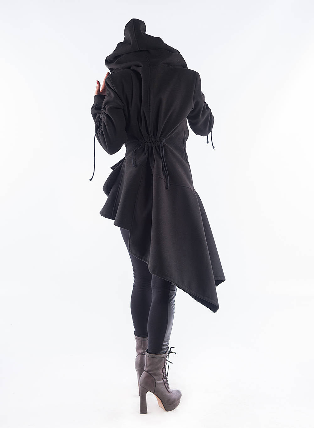 Winter wool coat in black, asymmetrical design with hoodie and left side pocket. There are laces on the sleeves, which allows you to choose the length of the sleeves.